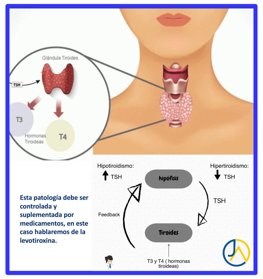 Cuando la glándula tiroides no produce suficientes hormonas para satisfacer las necesidades del organismo, la persona sufre de hipotiroidismo. Donde se produce una disminución de la producción de hormona tiroidea por parte de la glándula tiroidea. Por el contrario, la hipófisis, como ve que no se produce hormona tiroidea, comienza a producir otra hormona, la TSH (ésta es la hormona estimulante de la tiroides para que produzca más T4 y T3).