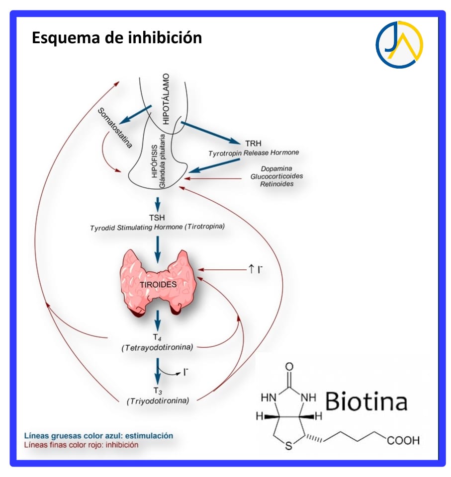 En conjunto con la Biotina, se presenta una interferencia al momento de arrojar resultados exactos del examen de tiroides, esto es debido a que la biotina, también conocida como vitamina B7 o B8 o vitamina H, altera y falsea los resultados de estas pruebas analíticas de la tiroides, ya que muestra valores demasiado elevados o muy bajo, por estar presente en altas cantidades dentro del torrente sanguíneo.